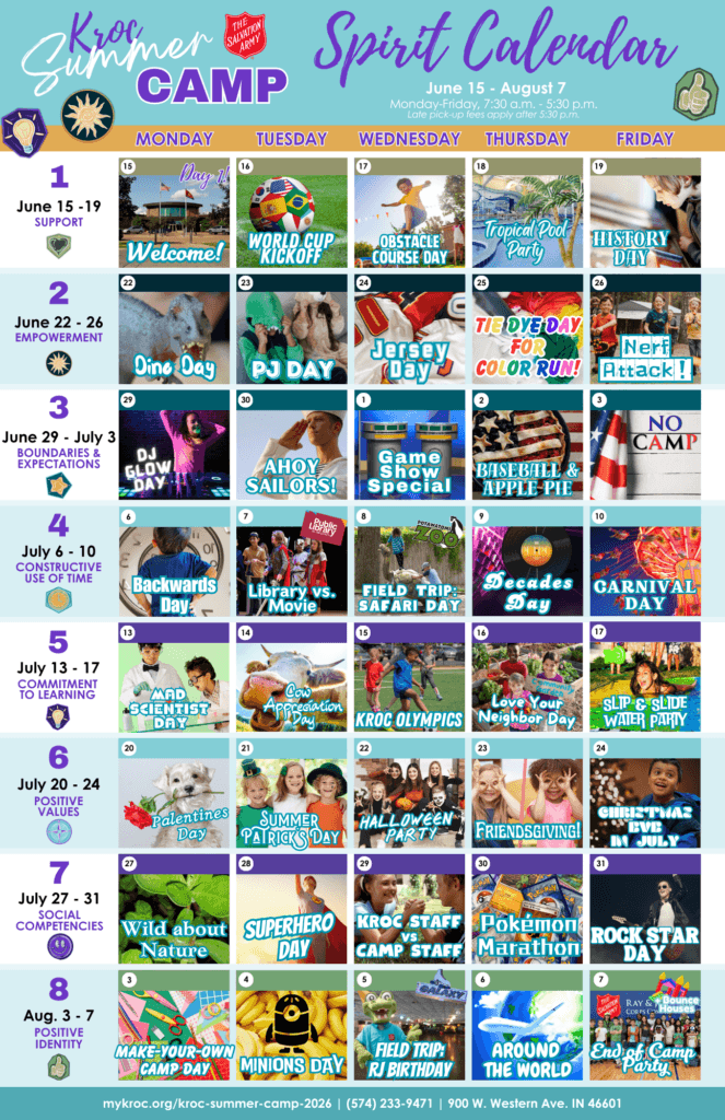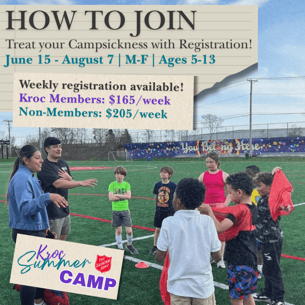 Kroc Summer Camp will run weekly from June 15th – August 7th, 2026. Weekly registration is available, and new this year – if you register for the whole summer, you will receive a free week of camp!
